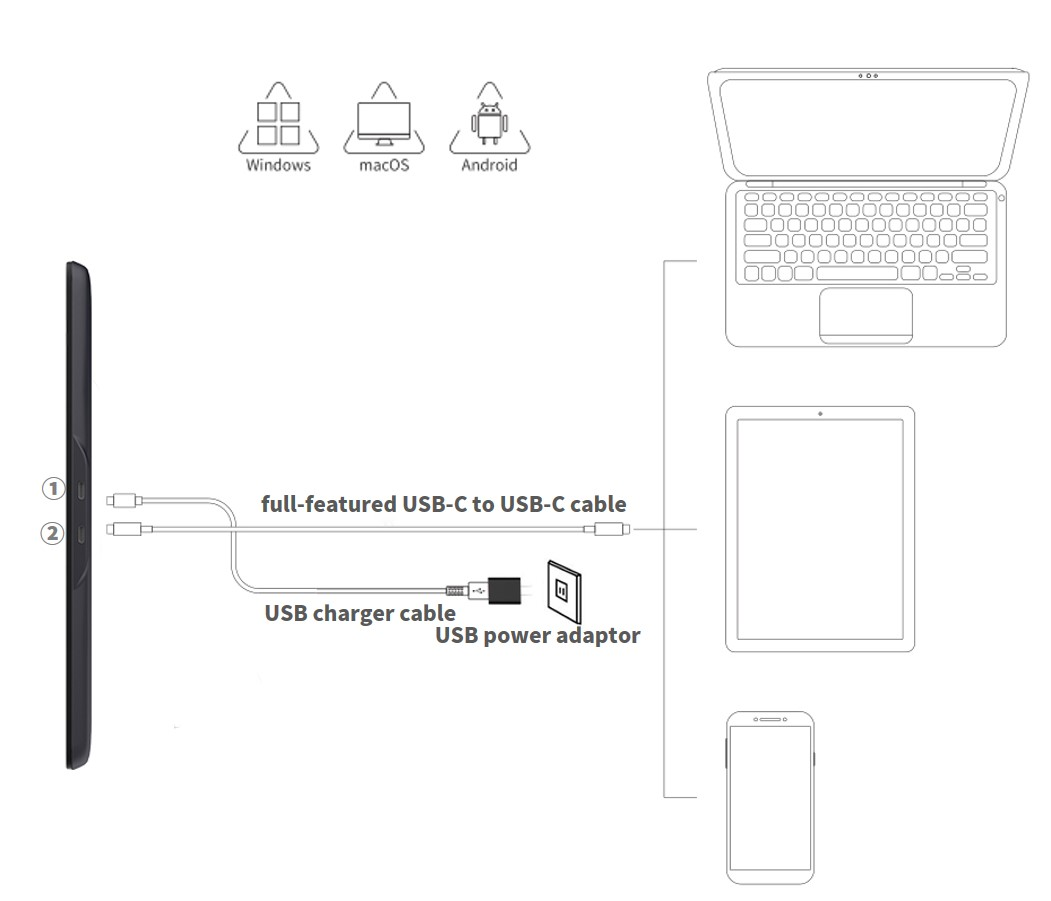 - USB-C to USB-Cケーブルを使って、液タブの➁端子(電源ボタンに遠いところの端子)からスマホー/タブレット/PCまで接続してください。