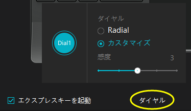 ドライバを開き、下の「ダイヤル」をクリック>Dial1/Dial2を選択>「Radial」を選択>Radialで使用できる