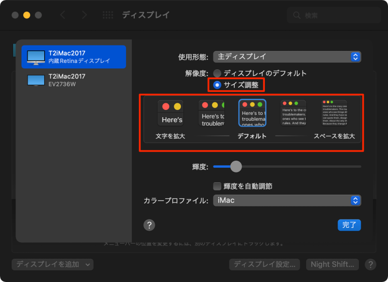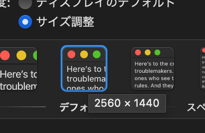 - 通常は、「ディスプレイのデフォルト」にチェックが入っていますが、「サイズ調整」に切り替えると、ディスプレイ解像度を変更できるようになります。