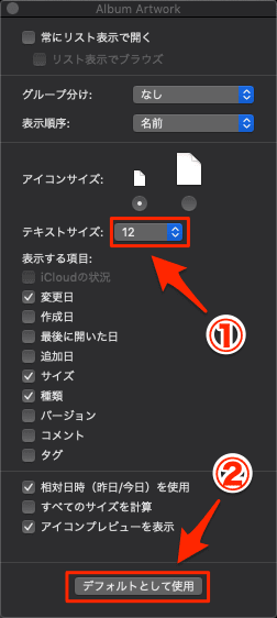 - ↑は、フォルダが「リスト表示」されている場合で、「アイコン表示」、「カラム表示の場合」は、設定画面が若干違いますが、やり方は同じです。(カラム表示の場合は「デフォルトとして使用」ボタンはありません)