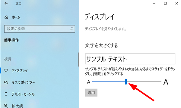 - サンプルテキストの文字が読みやすいと感じるサイズになったら「適用」をクリックします。適用をクリックすると、しばらく待った後にテキストサイズが変更されます。視認性に問題がなければウィンドウを閉じてください。