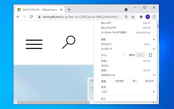 ブラウザなどの多くのアプリケーションでは、マウスのスクロール操作でウィンドウの表示サイズを変更することができます。そのため、特定のアプリケーションで文字が小さくて見にくい場合は、マウスのスクロール操作で文字を拡大してみてください。