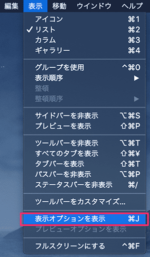 - メニューバーの「表示」→「表示オプションを表示」をクリック。ショートカットキーの command ⌘+JでもOK。