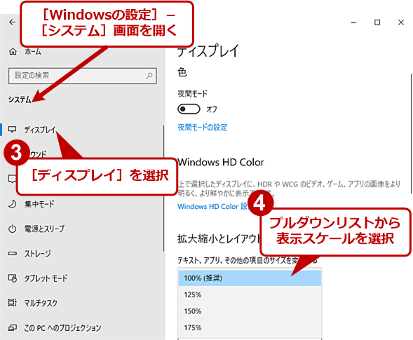 Windowsではディスプレイの表示スケールを拡大/縮小することで、文字やアイコンなどのサイズを変更できます。