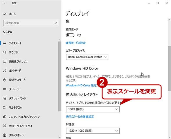マルチディスプレイの場合、設定を変更したいディスプレイを選択する。ここでは「ディスプレイ2」が選択されている。