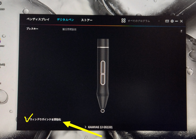 - 1.ドライバーで【ウィンドウズインクを活性化】をオンにします。