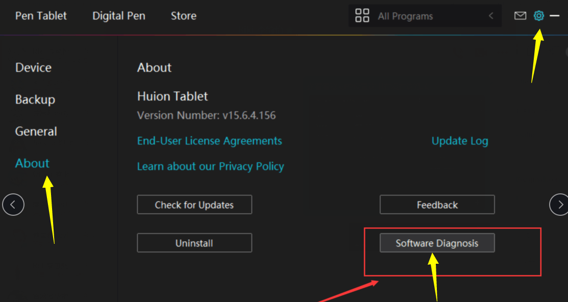 操作手順:[HuionTablet] > [設定] > [バージョン情報] タブ > [ソフトウェア診断] >Wintab32での [修理] をクリックします。