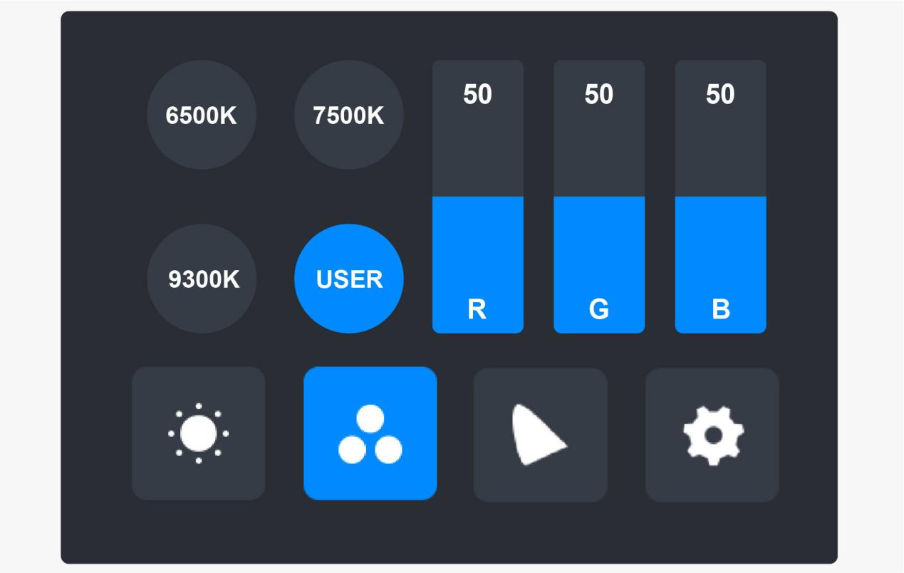 c.色温度:「6500K」、「7500K」、「9300K」、「USER」モードから選択します。 USERモードでは、RGBの値を調整することで色温度を細かく変更することができます。