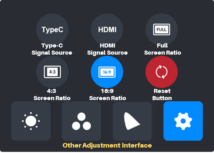 OSDメニューの一番下の4番目のアイコン(車のホイールのアイコン)をクリックし、TypeC、HDMI、Full(フル)、4:3、16:9、Reset(リセット)が選択できます。