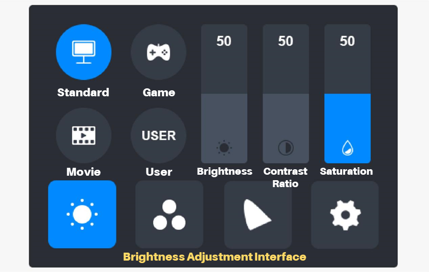 a.OSDメニューの左側には3つの4つのモードが選択できます:スタンダード・モード、ゲーム・モード、ムービー・モードおよびUSER(ユーザー)モード。OSDメニューの右側には明るさ、対比度と彩度があります。
