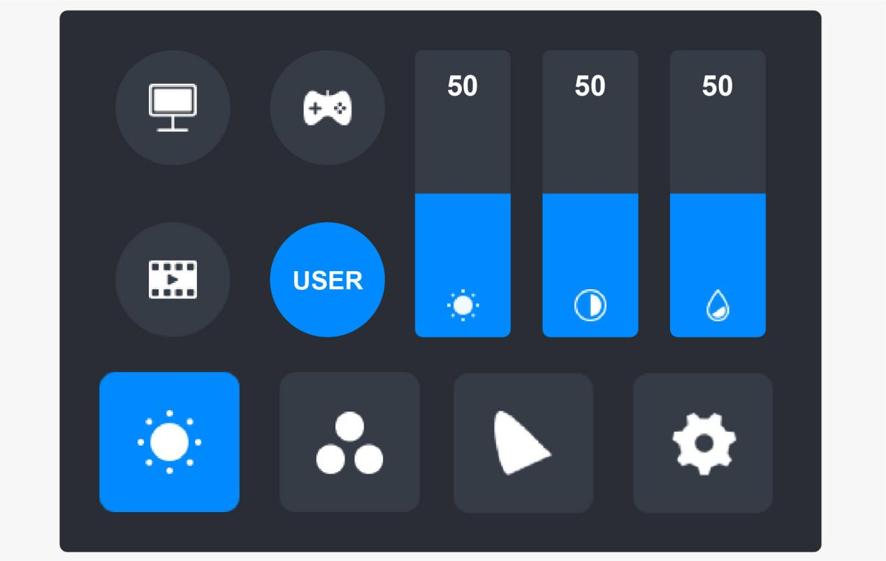 b.USER(ユーザー)モードを選択している場合、OSDメニューの右側の3つの項目(明るさ、対比度と彩度)が青になり、明るさ、対比度および彩度を調整できます。