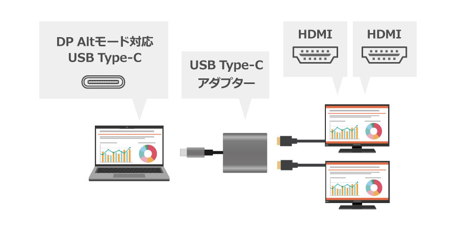 あくまでもプレゼンや動画上映など、同じ映像を2台で表示するニーズ向けです。デスクワークやクリエイティブな作業などで作業領域を広げたいのであれば、「ディスプレイ拡張」に対応した構成が必要です。その場合はUSB–HDMIアダプターやDisplayPortの活用が必須になります。