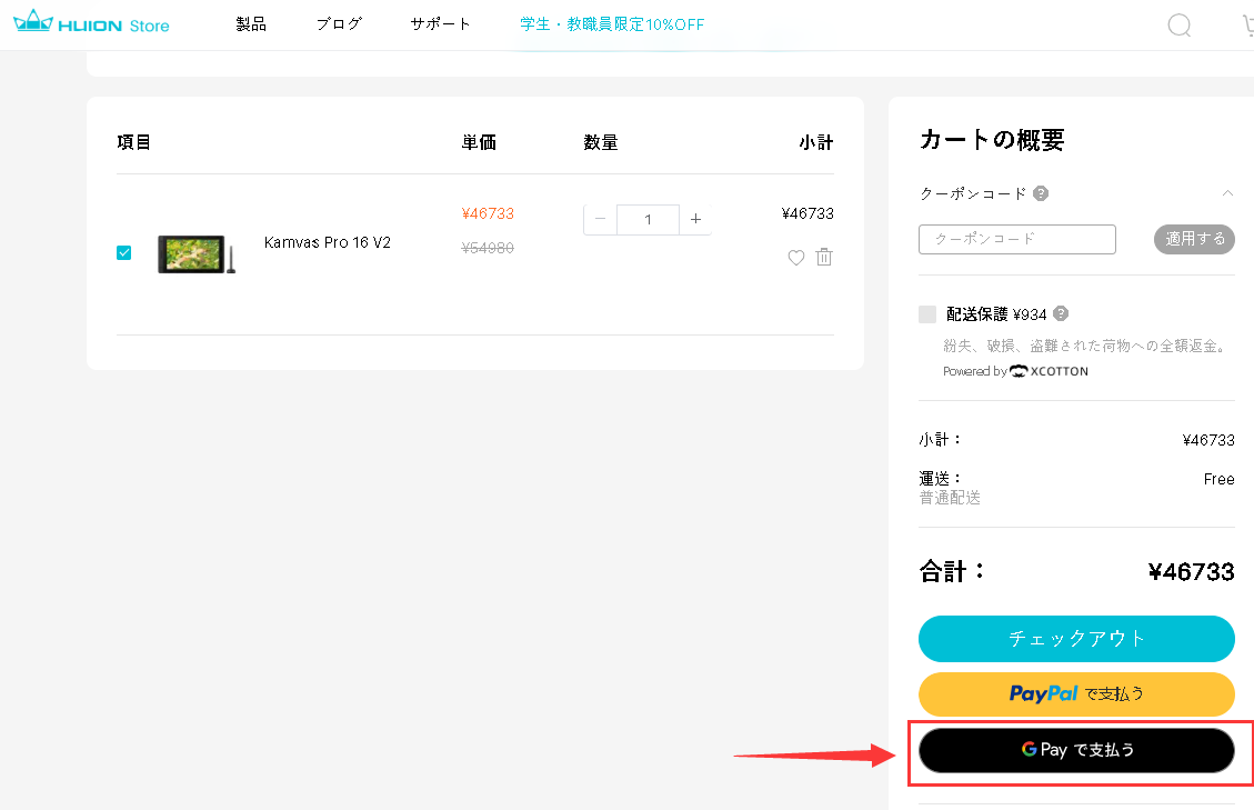 Google Pay を利用して HUION 公式ストアで商品をご購入いただけます。以下の手順に沿ってお進みください。
